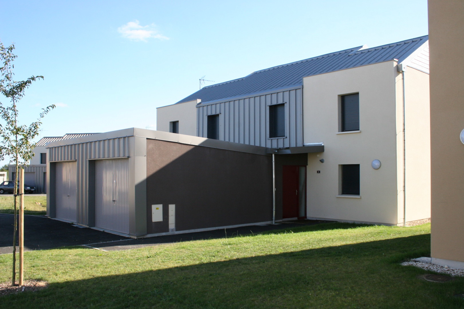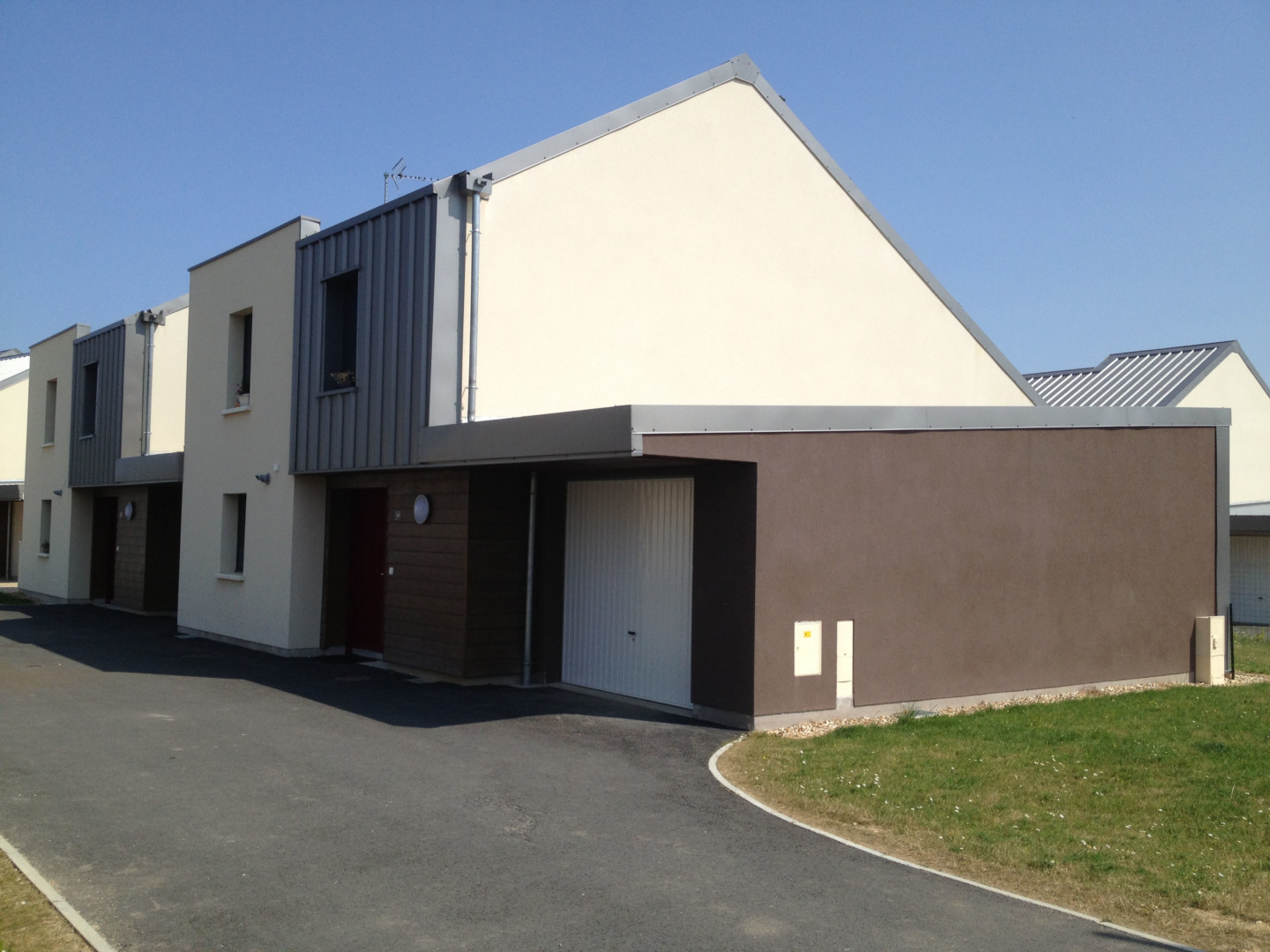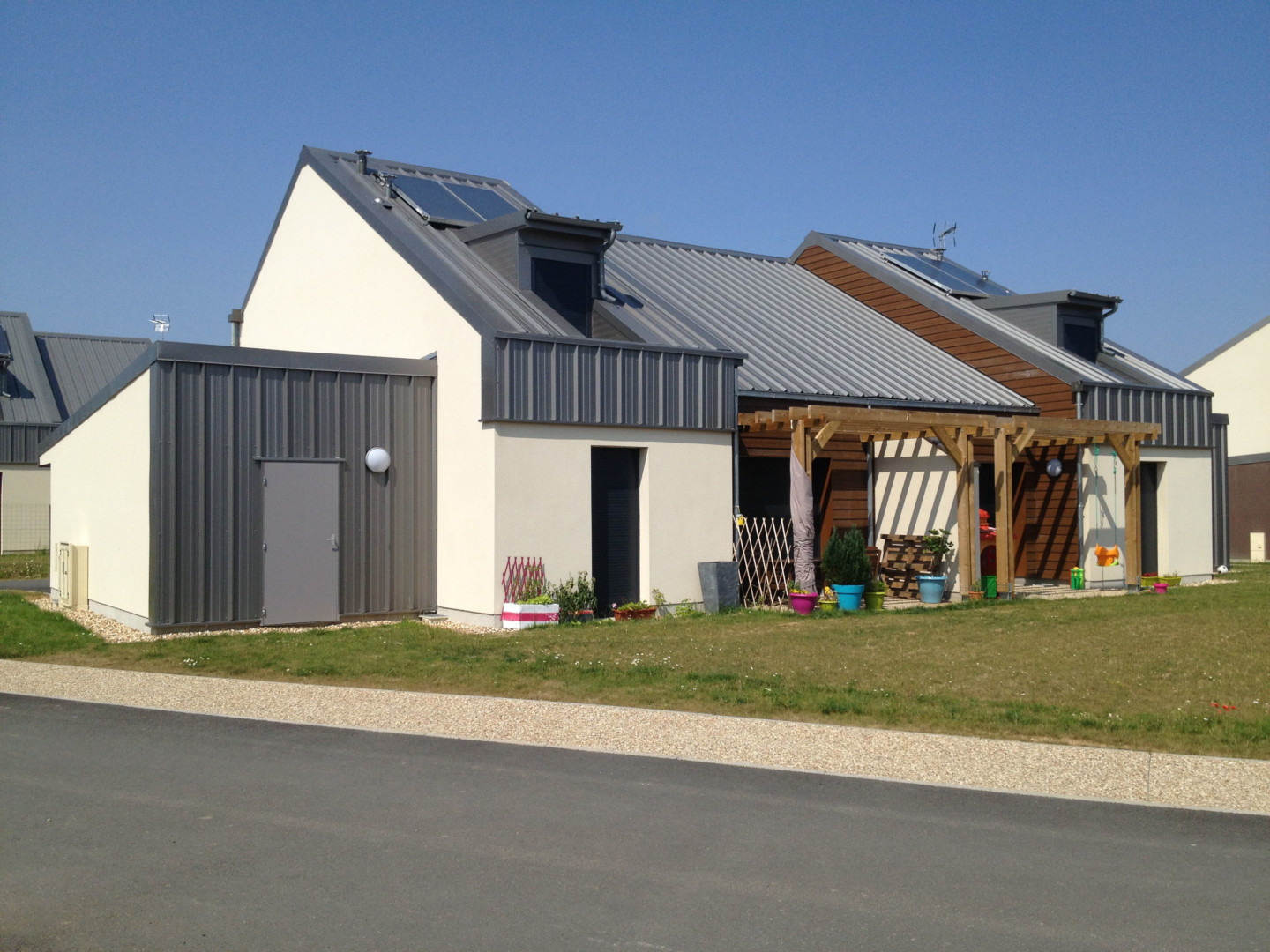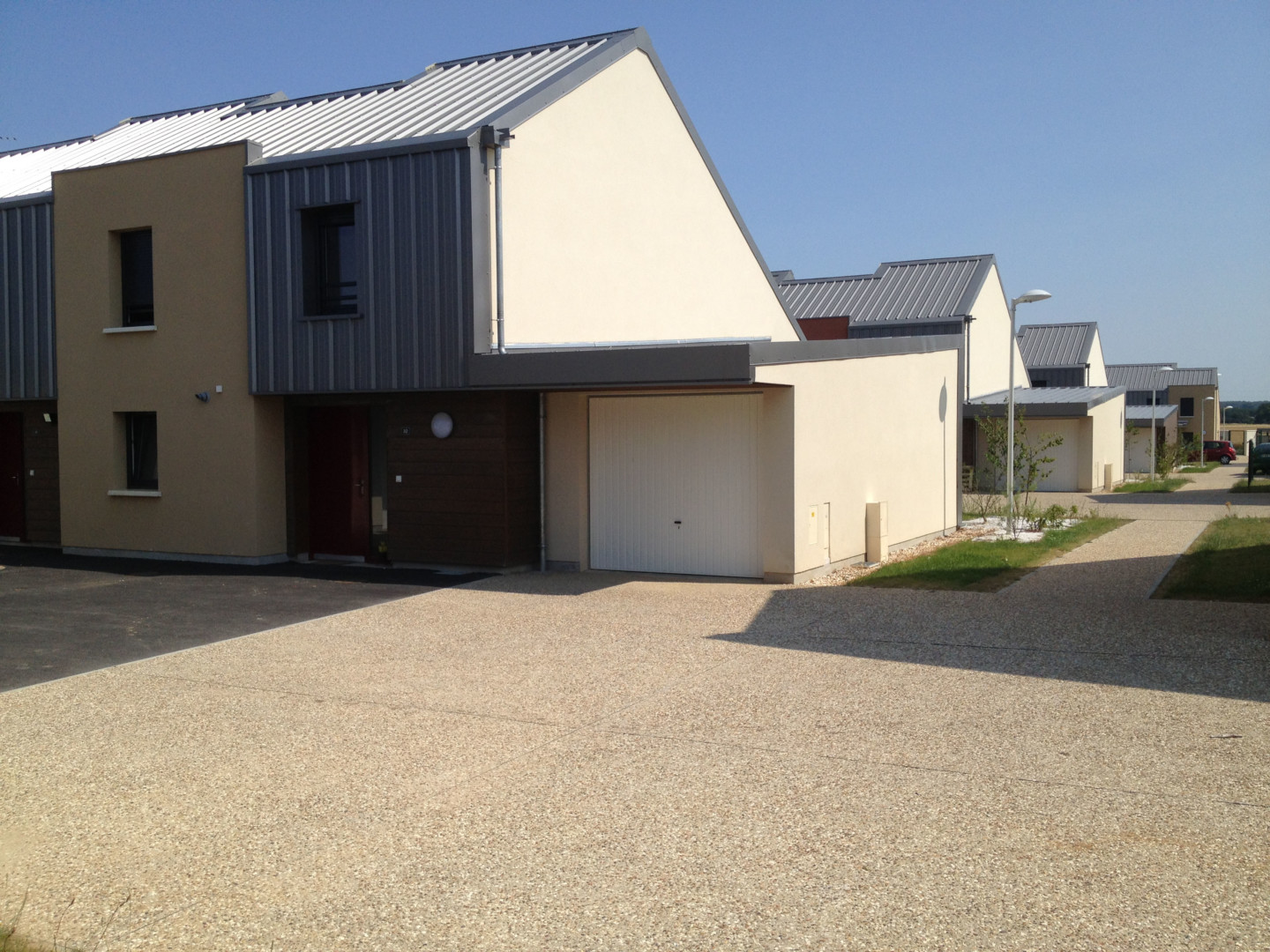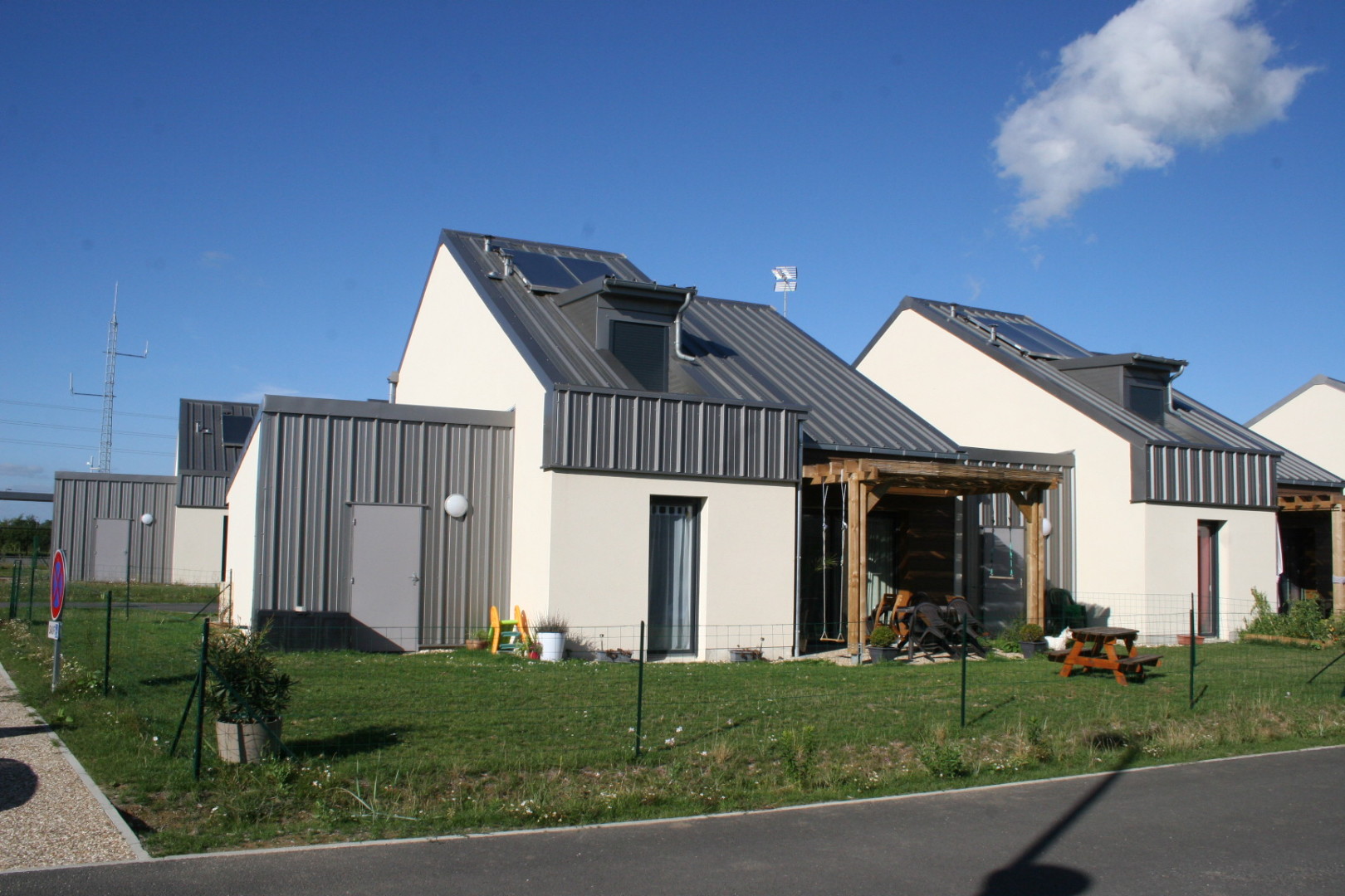 Les logements sont des maisons individuelles (T3, T4, T5 pour l’essentiel) que nous avons disposées de manière à mettre en place une architecture bioclimatique et à préserver l’intimité des logements (préserver la vie de famille en caserne).