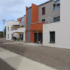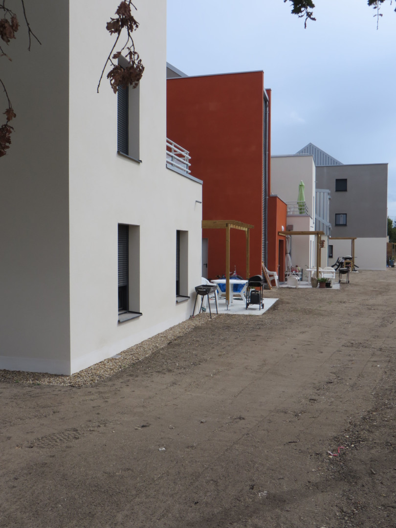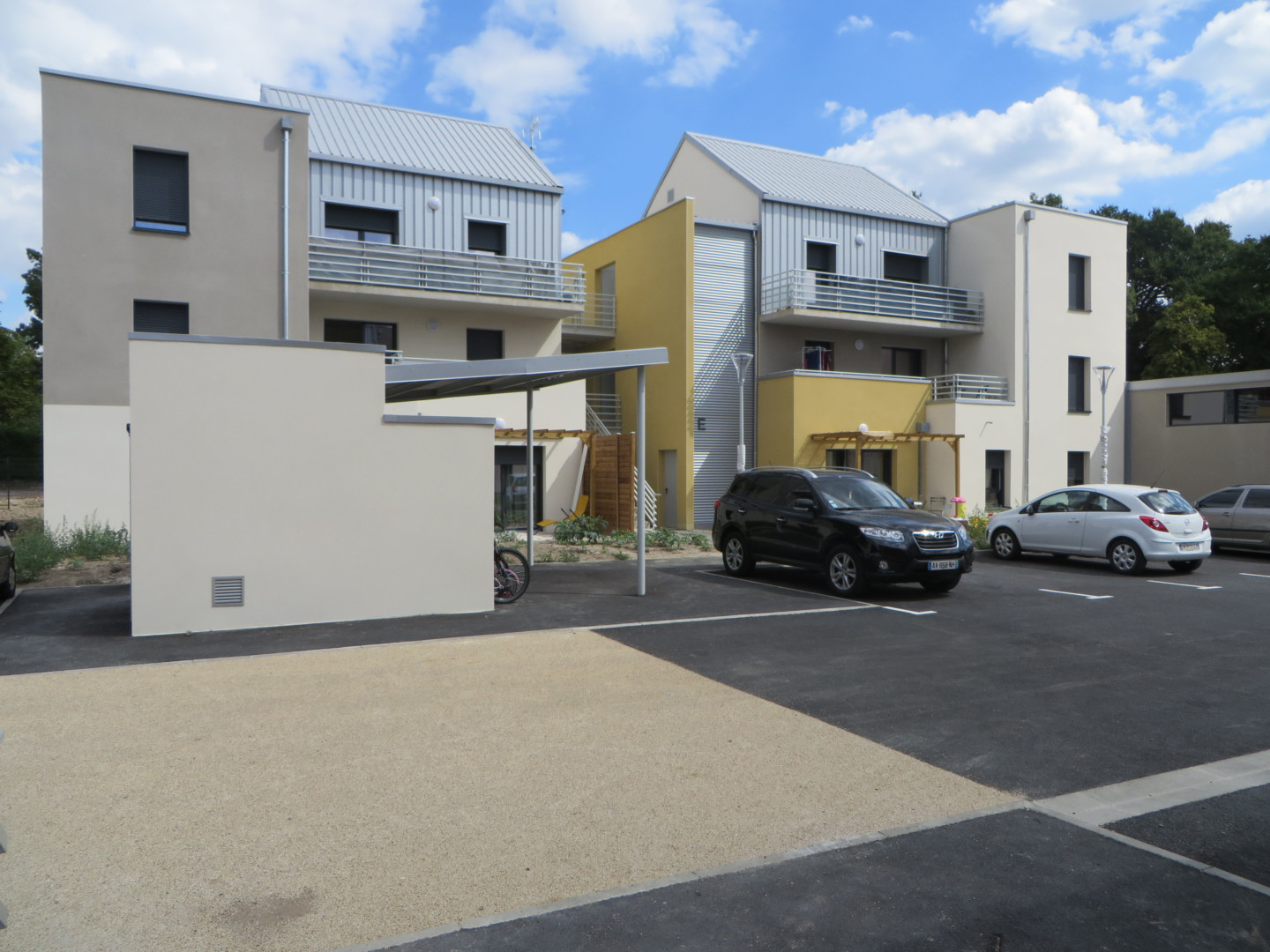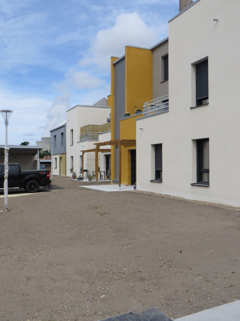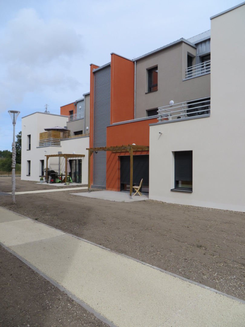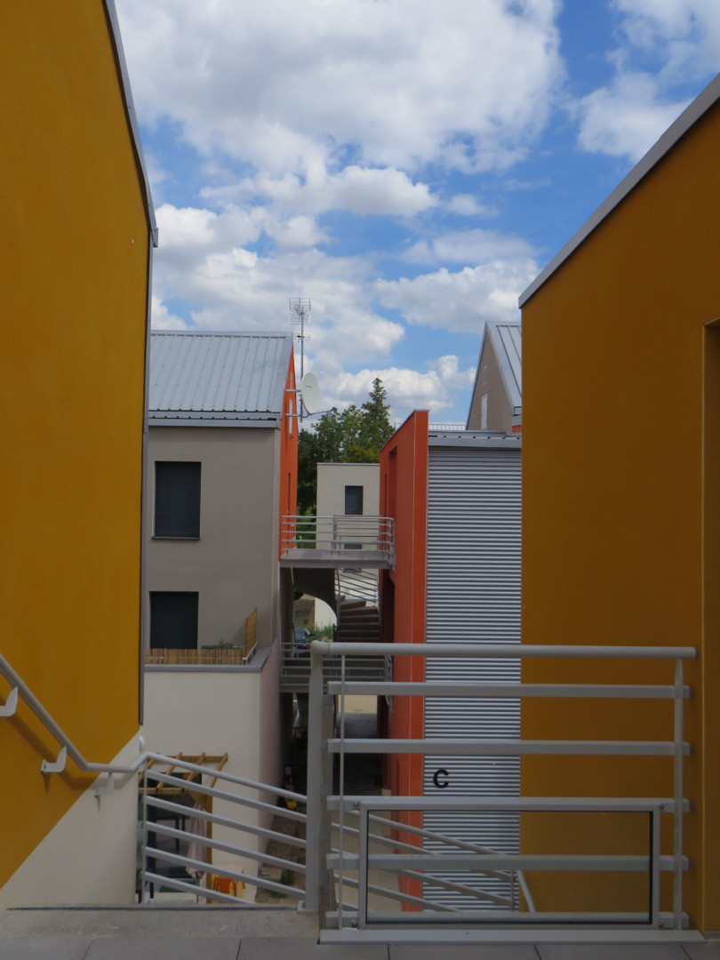 Sur un terrain d’un hectare, nous avons proposé un ensemble de logements semi-collectifs avec de larges terrasses orientées au sud-ouest. Chaque logement développe une conception bioclimatique avec les pièces de vie au sud et celles de service au nord. De ce dispositif résulte une grande préservation de l’intimité des logements. Jeux de couleur et de matériaux amènent une diversité sur des volumétries relativement identiques. Le bâtiment de bureaux adopte une architecture plus contemporaine.