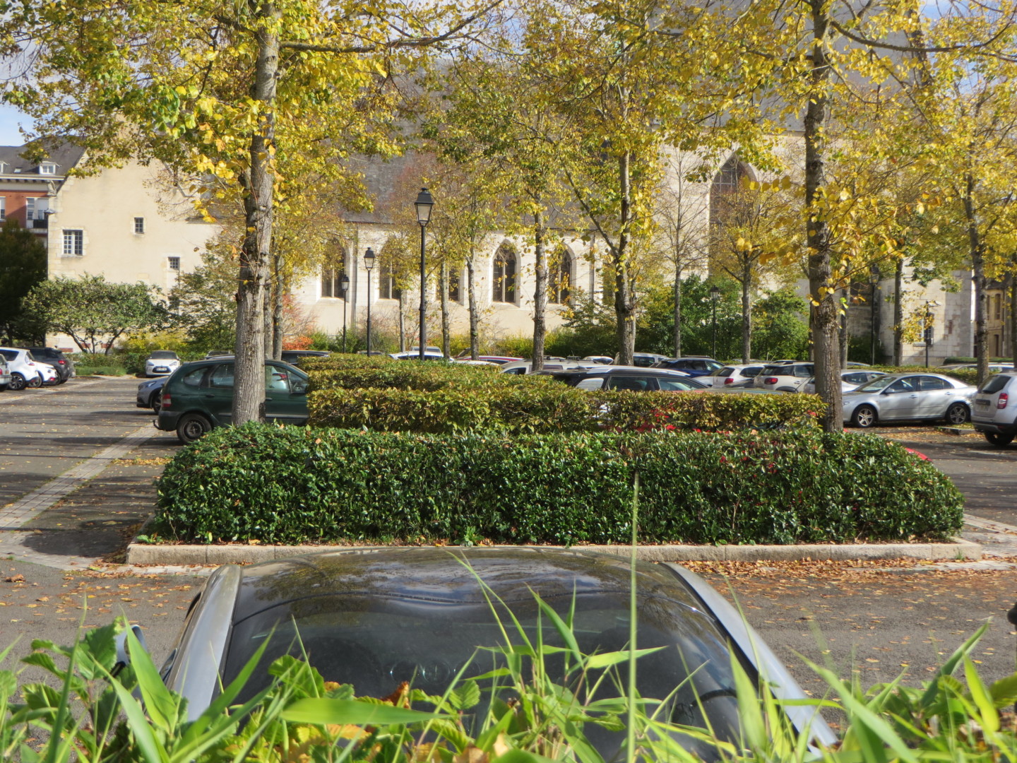 Il s’agissait de traiter un emplacement de stationnement de trois cents places comme un jardin, en jouant avec les plantations et le dénivelé du terrain pour mettre en valeur le bâtiment de l’Hôtel-Dieu, salle commune construite au Moyen Âge et de facture gothique. Des espaces de jardins, avec des bancs, et une statue y ont été aménagés comme lieux d’attente, et de rencontre pour ce parking de proximité.