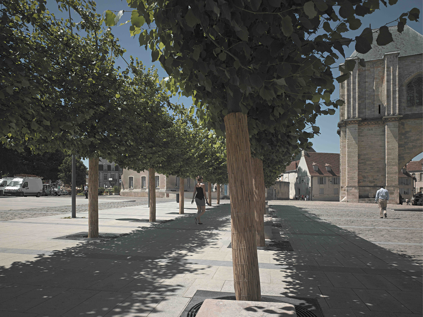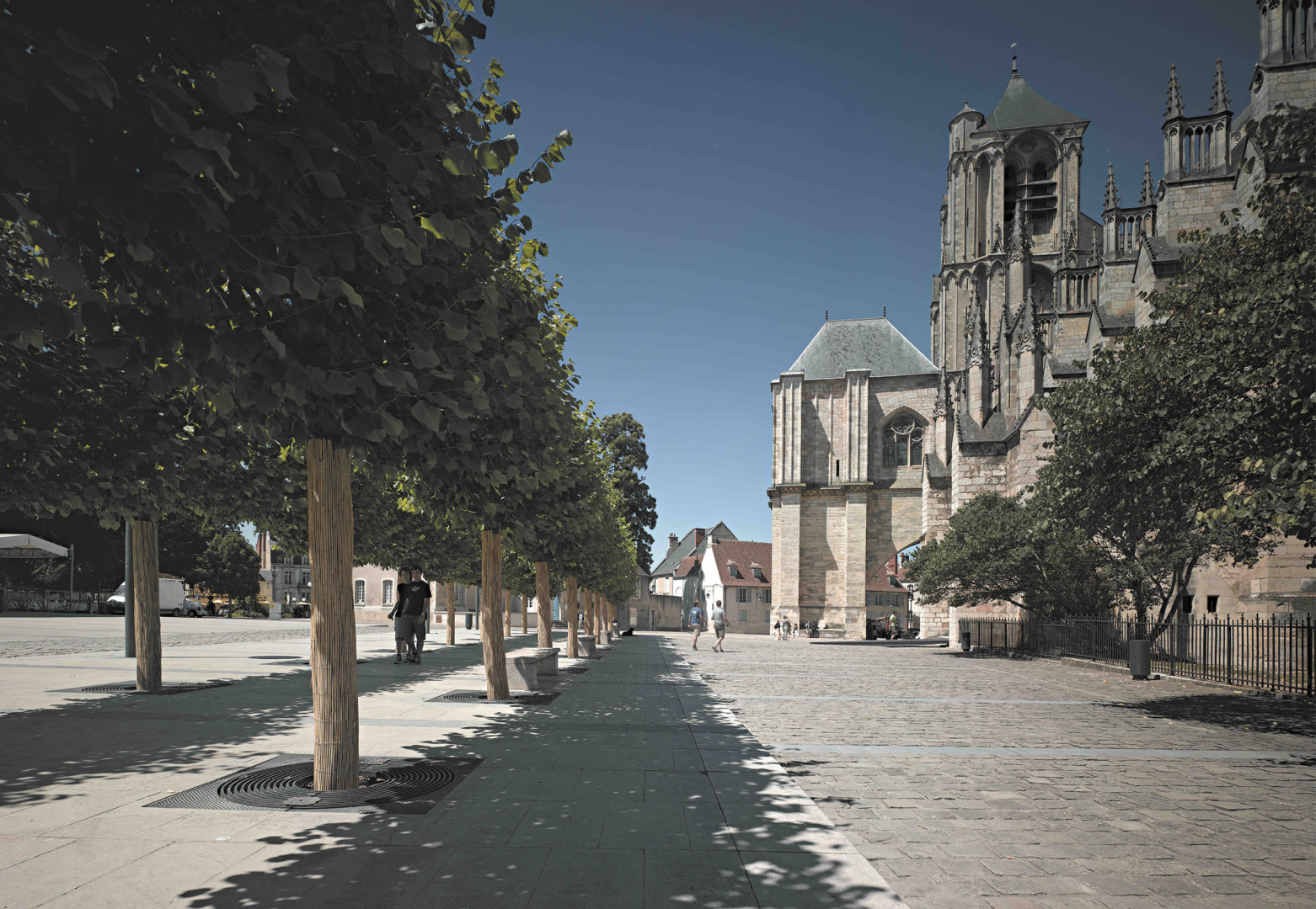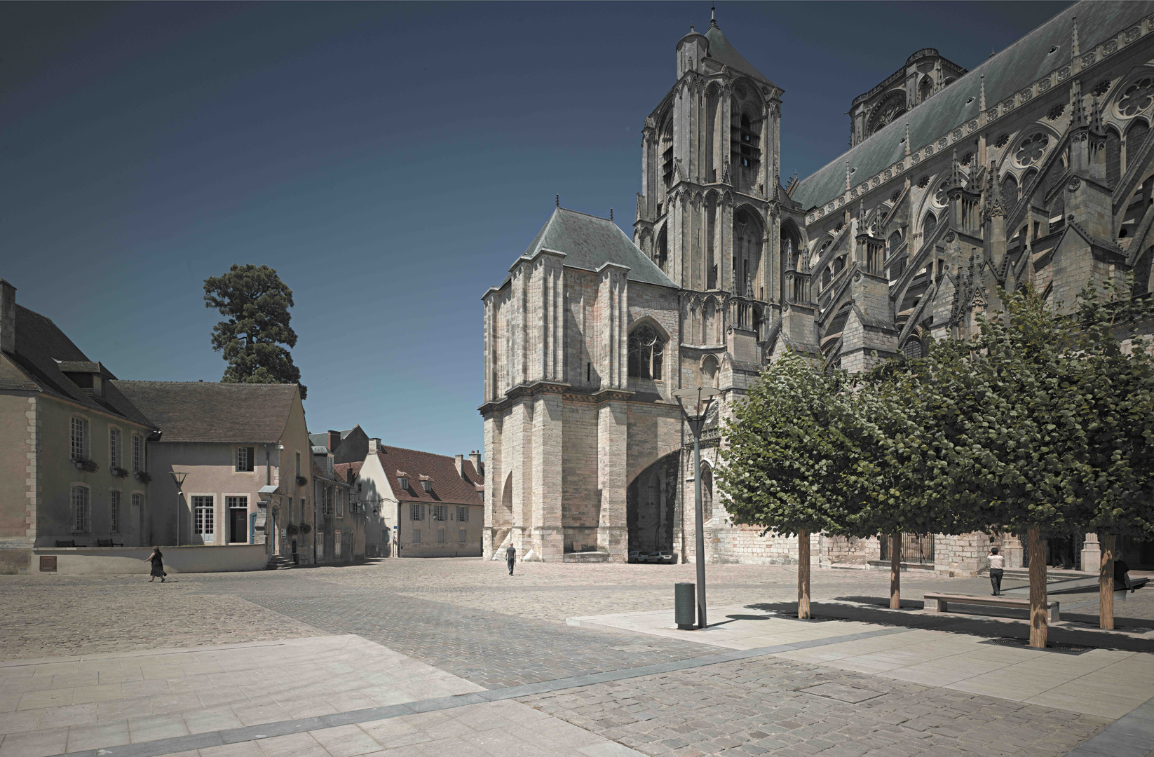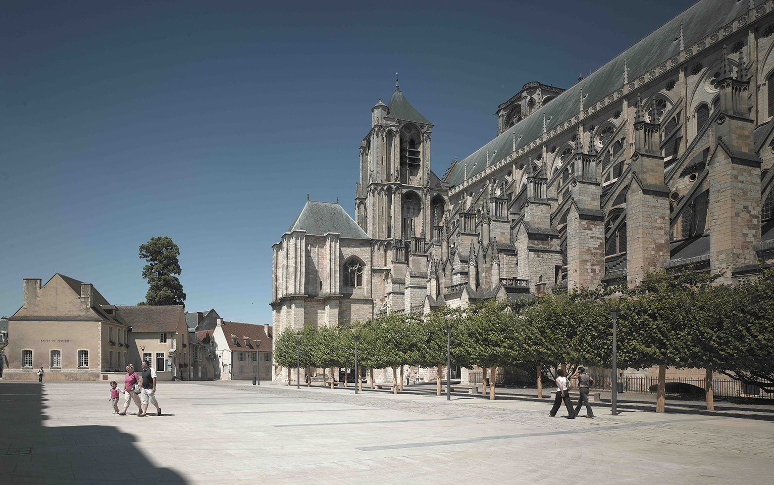 Fruit d’une collaboration avec Bernard Huet, architecte du Parc de Bercy et de la réhabilitation des Champs-Élysées, ce projet emblématique de la ville de Bourges était de redonner aux piétons les espaces du pied de la cathédrale de Bourges qui peu à peu étaient devenus des lieux de stationnement. Le projet mélange des dalles de pierre, des pavés en combinaison avec le réaménagement subtil d’un jardin. Il a été aussi à l’origine d’une mise en lumière de la cathédrale.